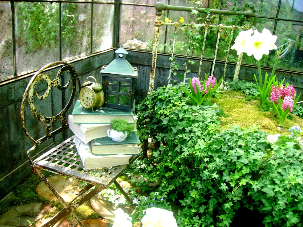 There is a fantastic greenhouse with bunnies and vintage items decorated in the best of ways in combination with bulbs, grass and blooms.